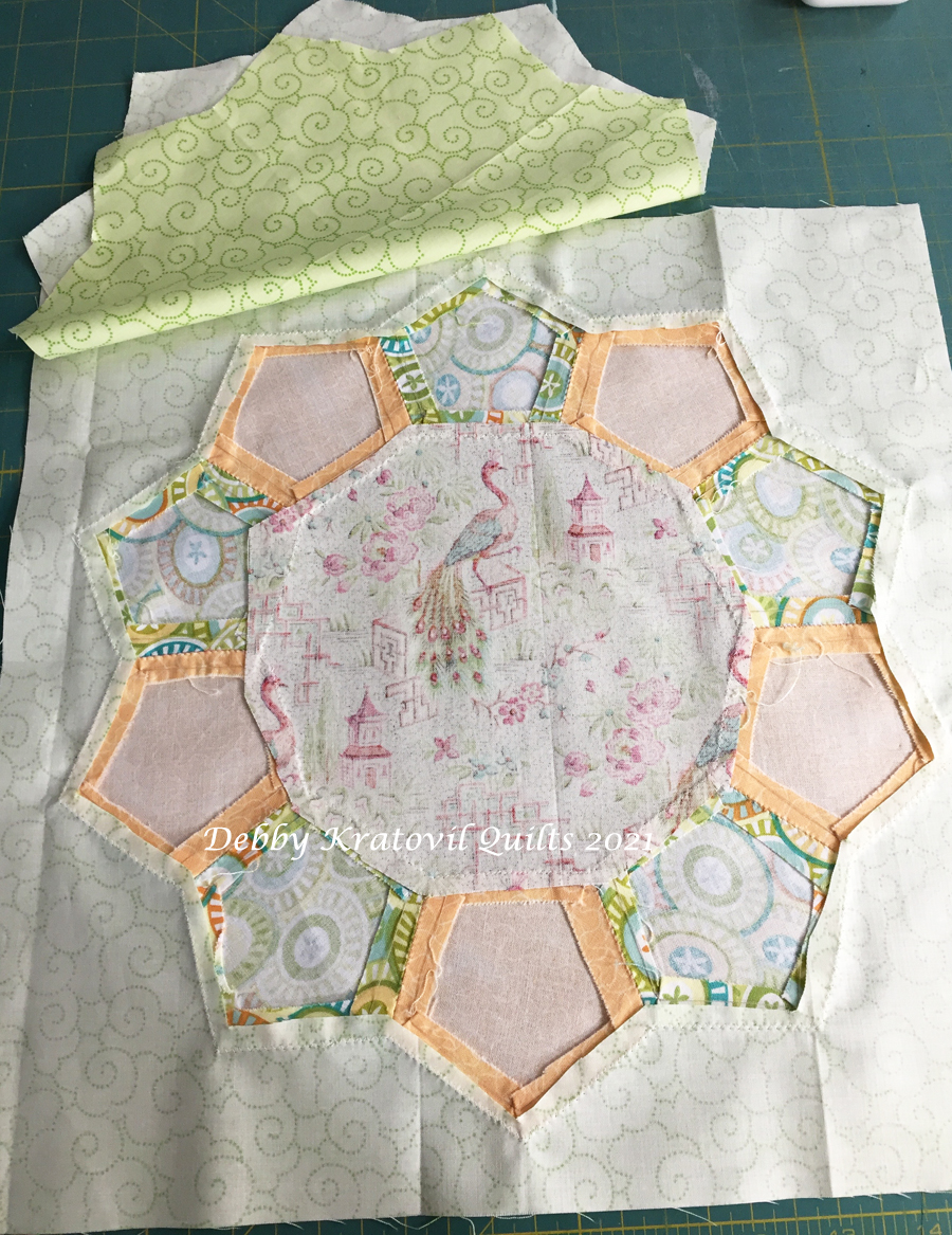 I made this pentagon wreath last year and it was looking for a special motif for the center. I remembered that pheasant print. I stitched the wreath onto the centered print and then trimmed it away. Now it's ready to be attached to the green background square.